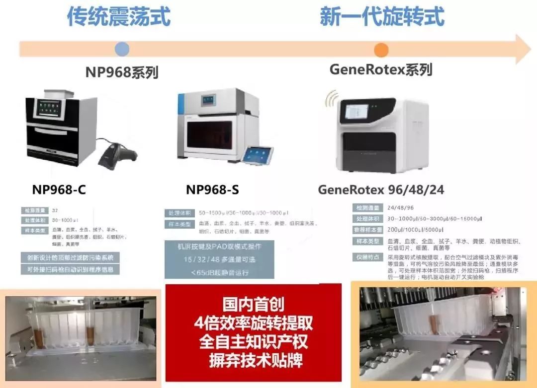 将灭活病毒后的样本进行核酸提取,产物用于后续检测。可采用手工法,也可采用大通量的自动化设备,如天隆NP968-C核酸提取仪、PANA9600E及PANA9600S全自动化核酸检测工作站等,更能降低操作人员被感染风险。